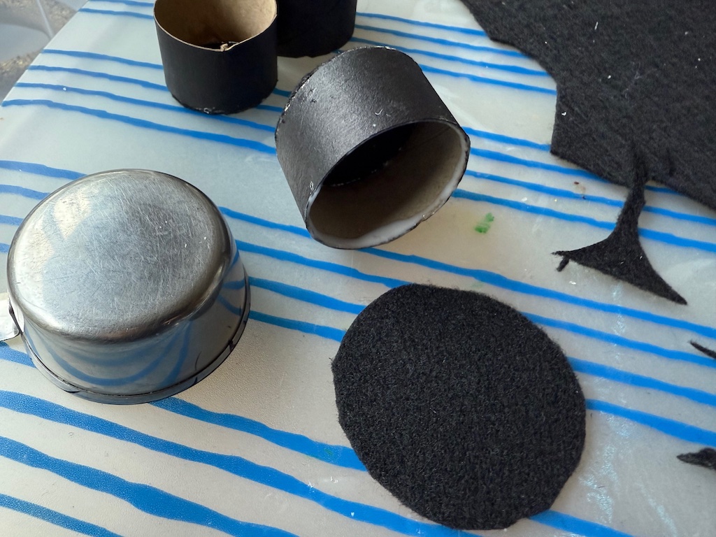 To make the top of the hat, trace around the toilet paper roll on black felt, cut out, and glue to the top of the painted toilet paper roll.